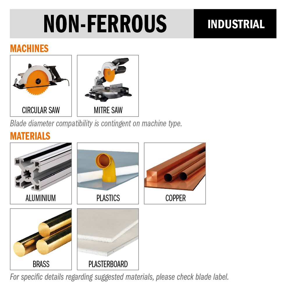 Í borðsögum og öðrum föstum vélum þar sem 190 mm blað, 30 mm gat og pin-holur passa við flansa/öxul. Fyrir efnisviðmið: Ál, ójárnblöndur og plast.