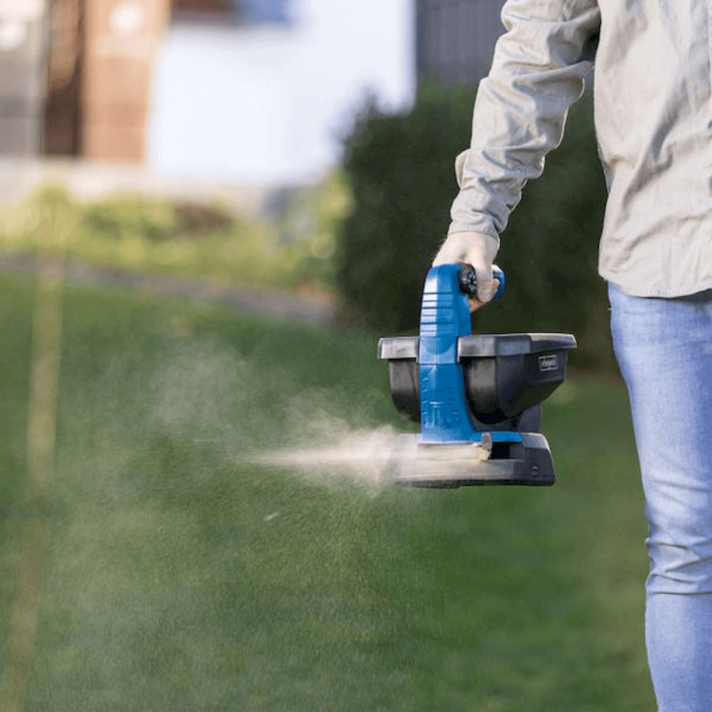 dreyfari 20v c-gsp800-x er rafhlöðuknúinn dreyfari fyrir salt og fræ. Í heitinu kemur fram 20V.