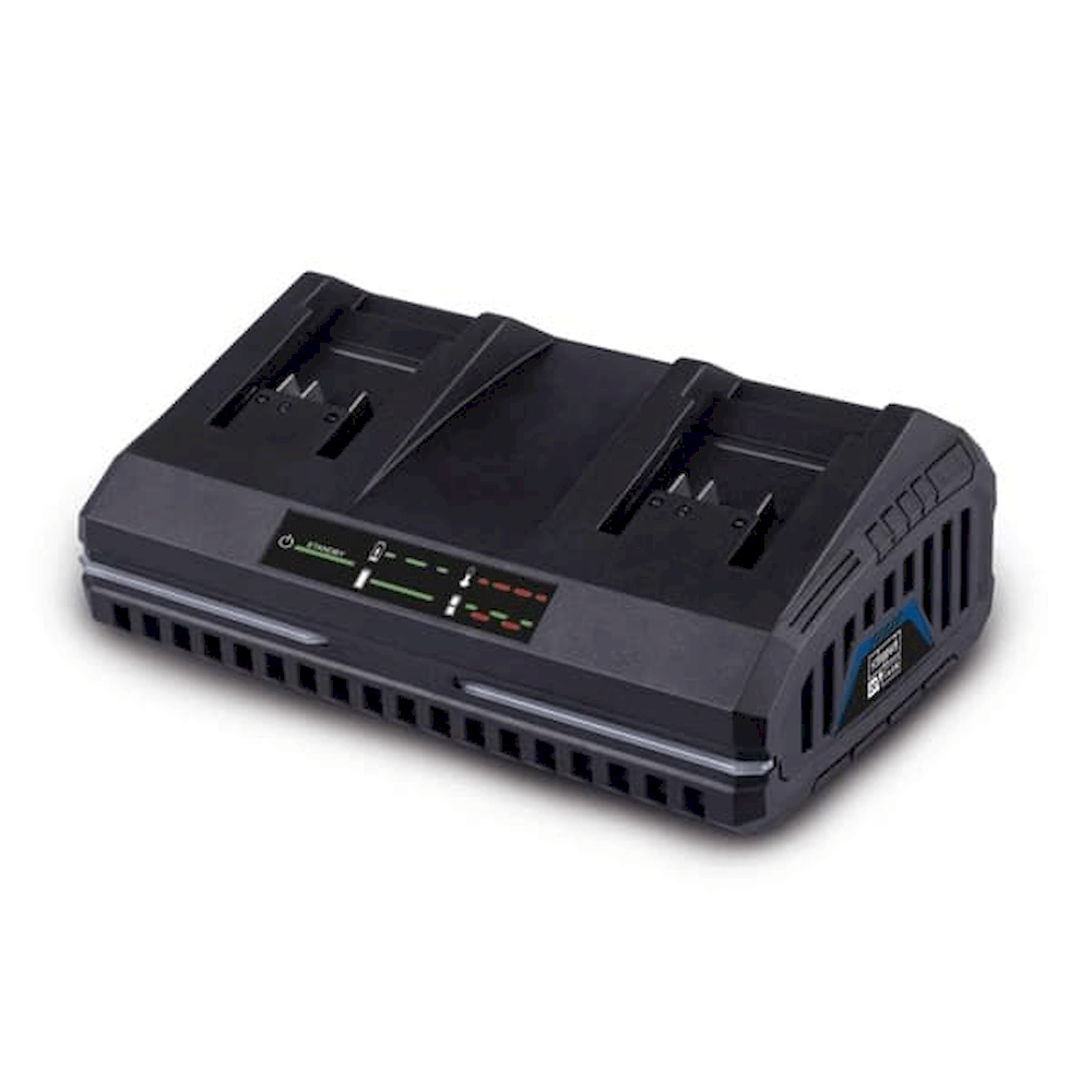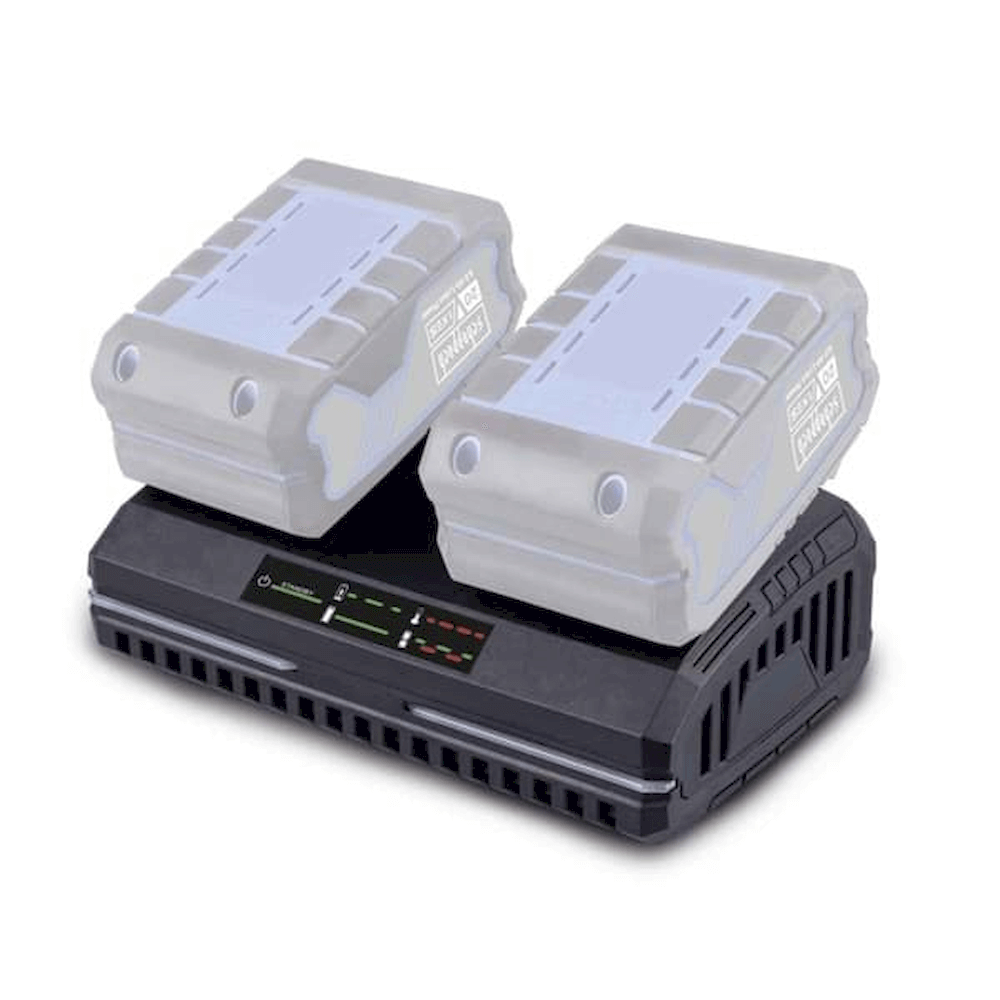 Tvöfalt hleðslutæki Scheppach 4,5 A er hleðslutæki fyrir tvær rafhlöður í senn þar sem draga þarf úr biðtíma og halda góðu flæði í daglegri notkun.