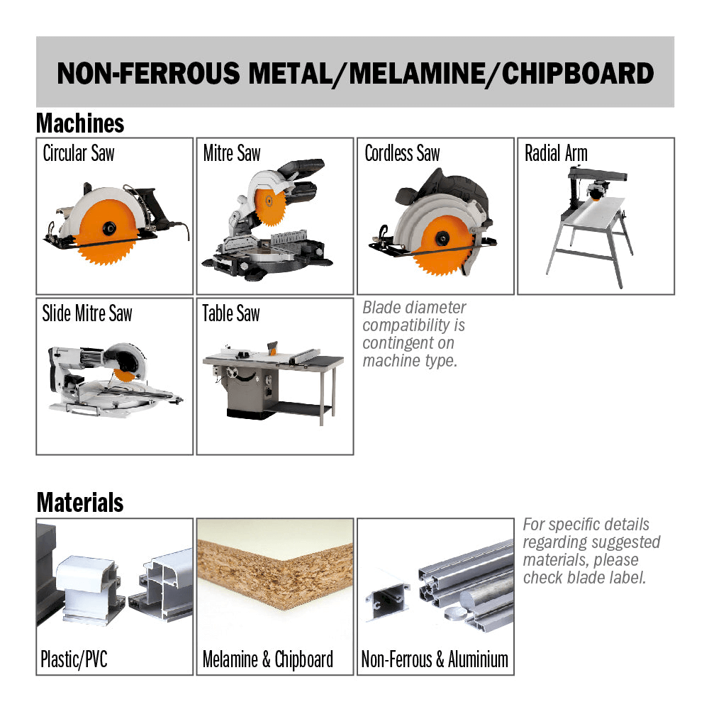 Í borðsögum og öðrum föstum vélum þar sem þvermál, miðjugat og hámarkssnúningur passa. Fyrir ál og aðra mjúka málma: Sjá umbúðir.
