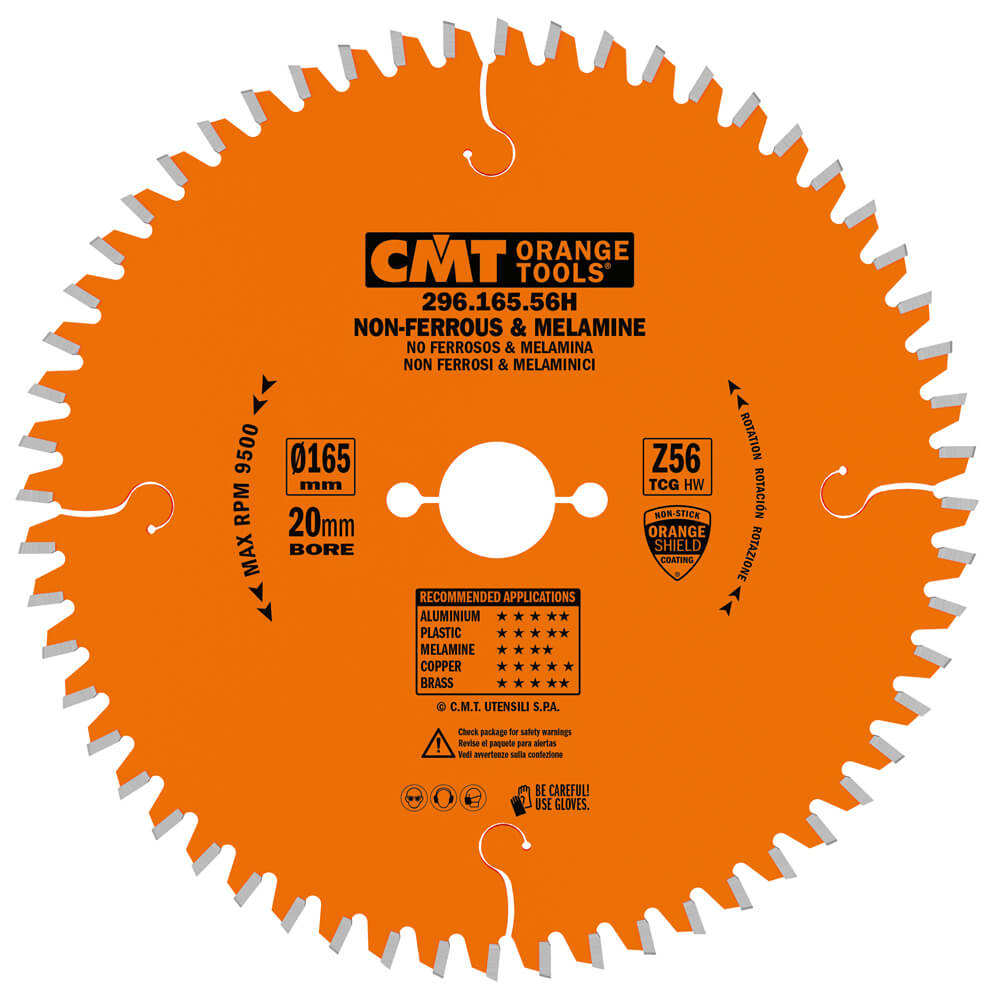 Sagarblað 165mm 20mm z56 tcg -6° fyrir fínan skurð í áli og plötuefni; athugaðu kerf og krókshorn.