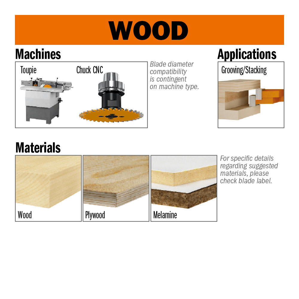 Í borðsögum og öðrum föstum vélum sem styðja dado/raufblað og þar sem þvermál, gat og hlífar leyfa þessa uppsetningu.