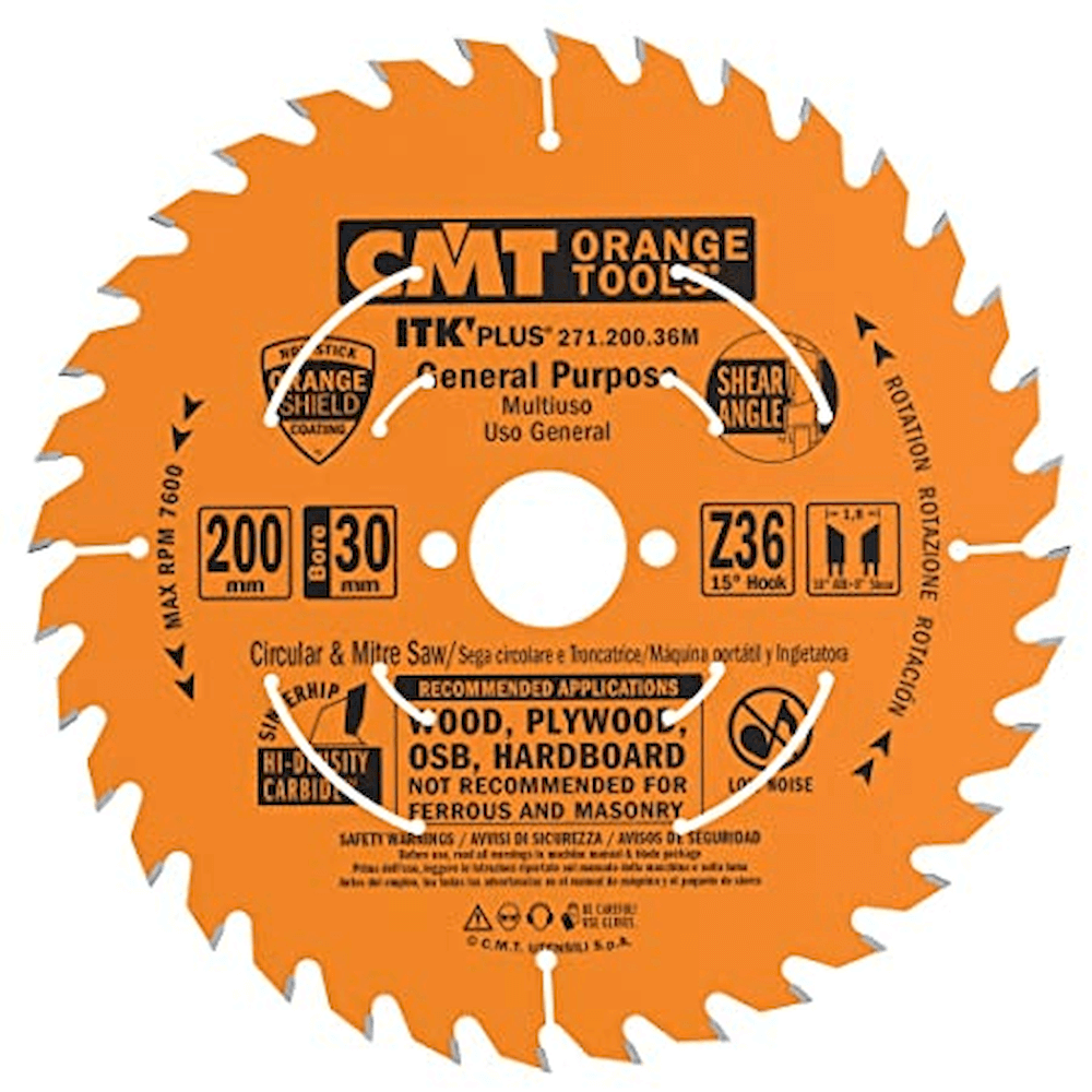 Sagarblað 200×30 mm með Z36 tönnum (sagarblað 200mm 30mm z36 rip & crosscut cmt) er ætlað fyrir skurð þar sem þessi mál eiga við.