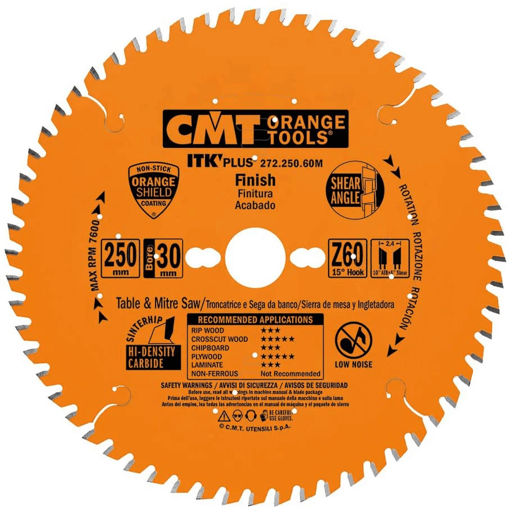 Sagarblað 250×30 mm með Z60 tönnum (sagarblað 250mm 30mm z60 fine compound cmt) er ætlað fyrir skurð þar sem þessi mál eiga við.