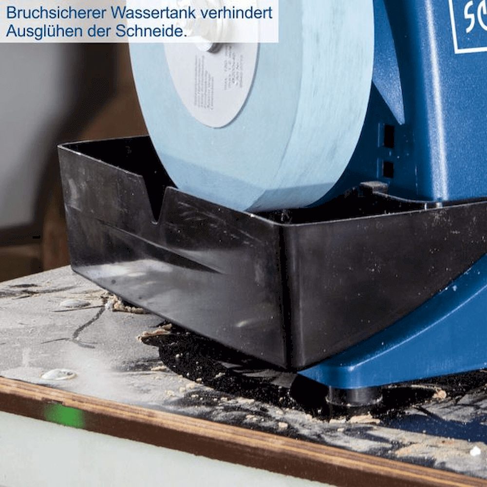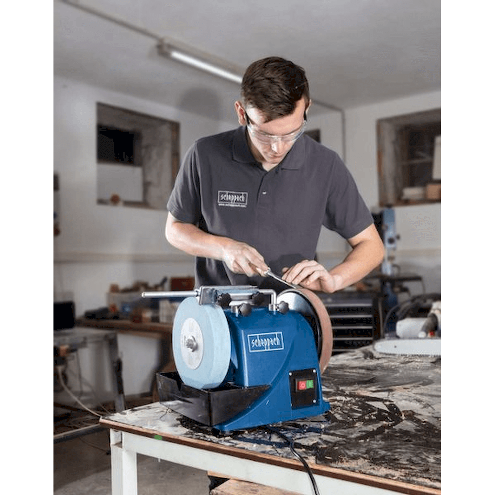 Vottslípivél Scheppach Tiger 2000 S er brýningarvél fyrir hnífa og verkfæri þar sem vatnskæling og stöðug eggsetning skipta máli.