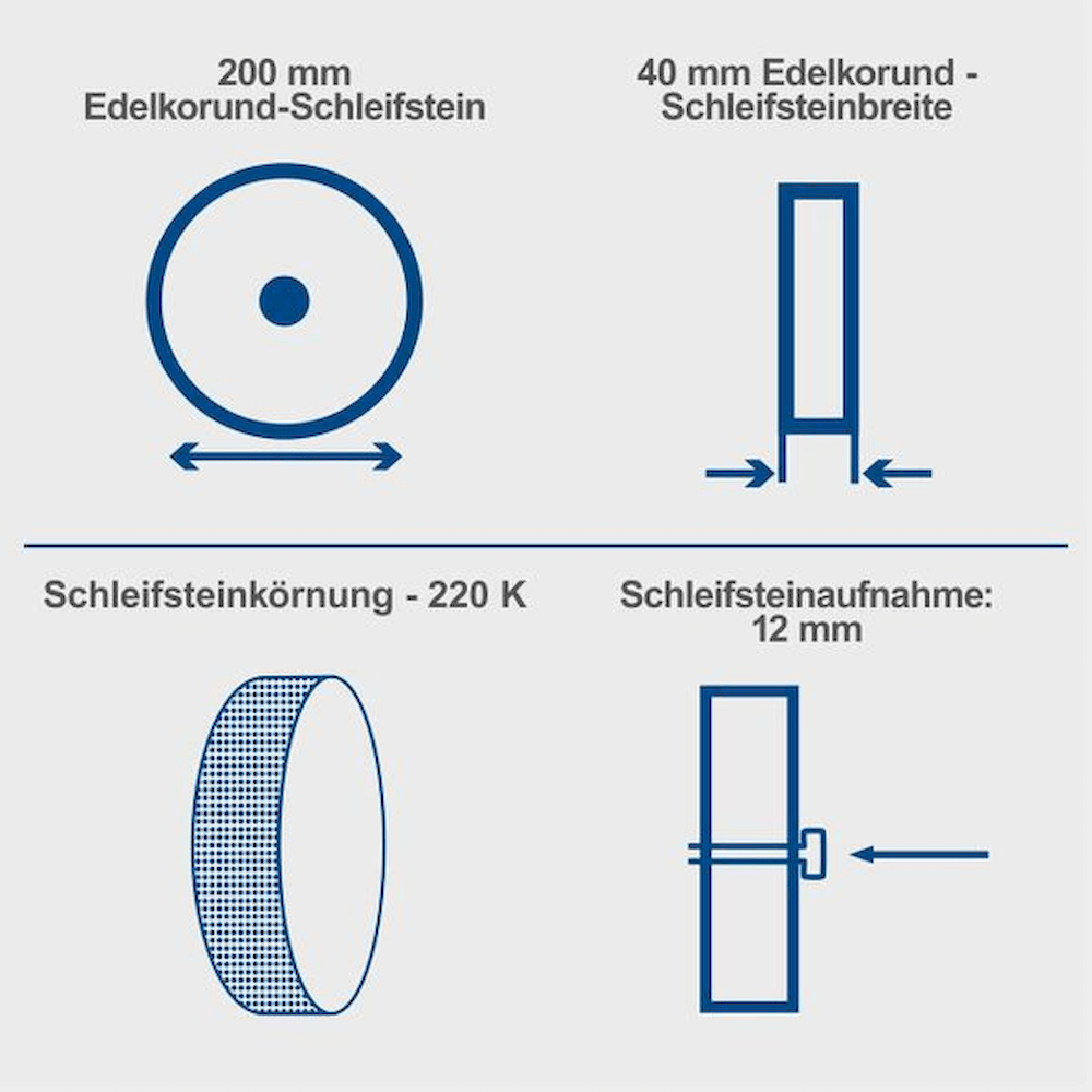 - 200 x 40 mm slípisteinn og 220 x 30 mm leðurhjól samkvæmt gögnum.