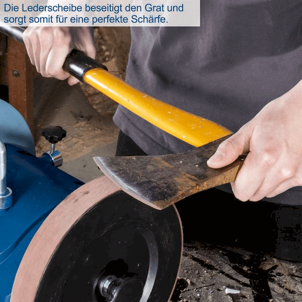 Vottslípivél Scheppach Tiger 2000 S með 200 x 40 mm steini, 220 mm leðurhjóli og 120 snún./mín fyrir nákvæma brýningu.