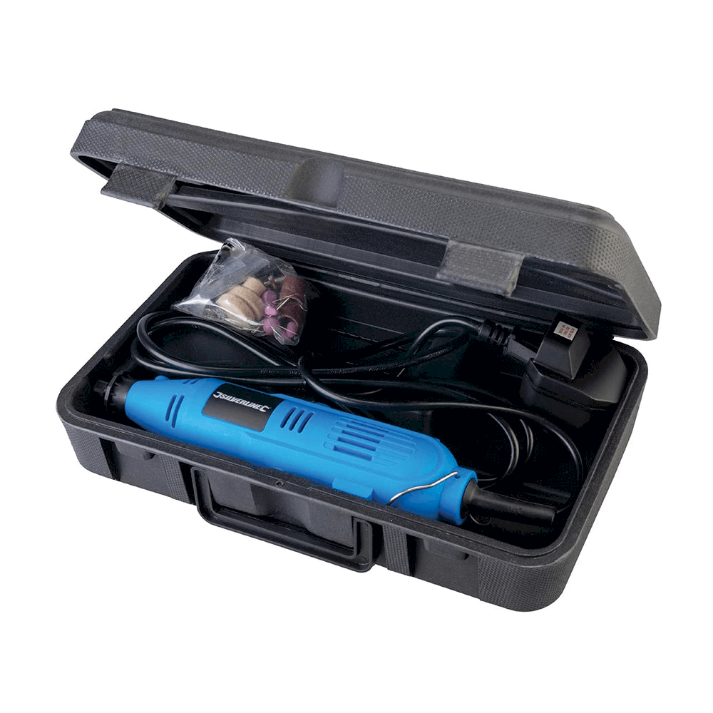 Multi rotary tool Silverline 249765 er fjölnota smáverkfæri fyrir skurð, slípun, fæginu og útskurð þar sem þörf er á breytilegum hraða og fylgihlutum.