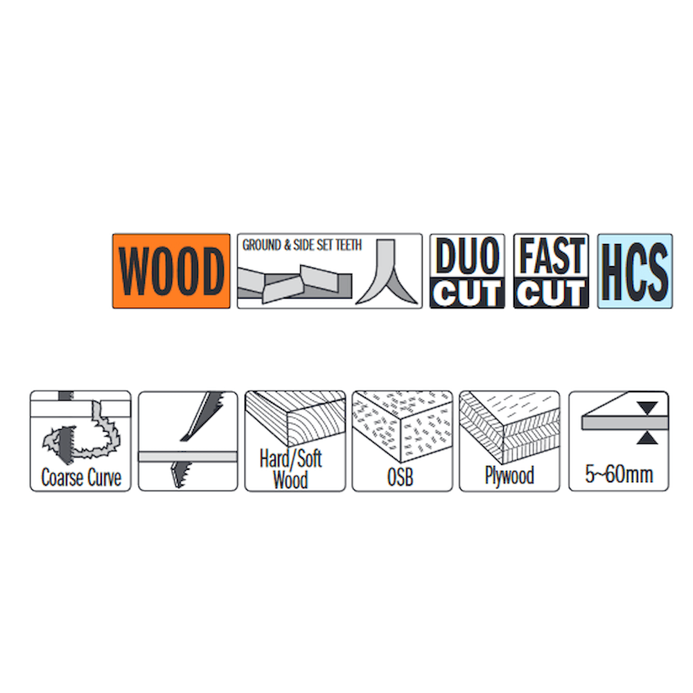 Stingsagarblöð fas cut 100mm 5-60mm 5st fyrir stingsög; athugaðu skaftgerð og merkingar á umbúðum.