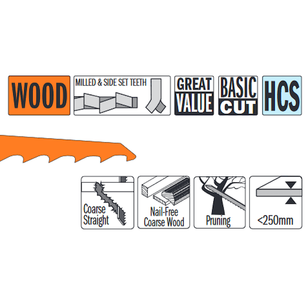 sverðsagarblað 300mm 3tpi 5stk timbur fyrir notkun sem kemur fram í heitinu; athugaðu lengd, tpi og festingu.